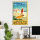 Nicht surfen, wie wir es jetzt kennen. Surfbaden in Südafrika. Eine Reisewerbung der Gewerkschaft Castle Line nach Südost-Afrika. Das Surfen besteht aus einer Frau, die auf einer flachen Plattform mit einem Seil stehend ist.