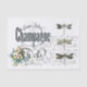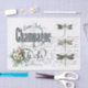 Schöne Vintage Libellen, Vintage französische Handschrift, großartige Typografie einer französischen Champagner-Werbung und ein kleines blaues und gelbes Blumennossek Vintager Stiefmütterchen und vergessene-me-nots machen ein elegantes französisches und naturbelassenes Gewebe für Geschenkverpackungen oder -skizzen und Entcoupage.