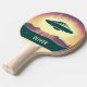 Dieses personalisierte Tischtennis-Paddel besticht durch eine Vintage Cartoon-Szene eines UFO, das durch einen faszinierenden Sonnenuntergang strömt. Der feurige Horizont wirft eine dramatische Silhouette auf die Landschaft unten.