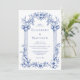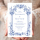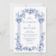 Diese Vintag inspiriert Hochzeitseinladung weist eine Grenze zwischen klassischen Säulen und Blumenmotiven in blau auf weißem Hintergrund auf. Die Namen des Ehepaares erscheinen im klassischen Serif-Schriftart, der übrige Text ist kursiv.