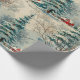 Dieses Papier hat ein sich wiederholendes Muster einer festlichen Winterszene. Das Design zeigt eine verschneite Landschaft mit einer Mischung aus immergrünen und nackten Bäumen, die alle mit weißem Schnee bedeckt sind. Ein großer, schneebedeckter Weihnachtsbaum mit roten Ornamenten steht im Mittelpunkt des Musters. Rechts vom Baum befindet sich ein hübsches, rotes Haus mit Schneedach, und links ist ein blauer Hof mit einem rauchenden Kamin. Das Ganze wirkt klassisch und nostalgisch und erinnert an einen friedlichen, altmodischen Urlaub.