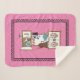 Diese Sherpa-Fleecedecke ist rosa mit einem Vintagen, weißen Kochherd mit Goldschnitt und Blume mit Töpfen, Pfannen und einer Kaffeekanne, die oben auf dem Ofen braut. Der extravagante schwarze Rand ist um den Ofen herum.