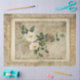 Links Seitenversion, "Vintages weißes Blumenzitat Ephemera Decoupage Art Heavy-Weight-Papiers". Botanische Illustration, die elegant in Watercolor gemalt wurde, weiße Rosenblüten mit Blattgrün. Ein gereizter, geschichteter Pergament-Ephemeride-Hintergrund mit einem sehr subtilen weißen Kalligraphiehandschreibüberlagerungen in Weiß über dem blassfarbenen Damast-Muster. Grafisch entworfen von Audrey Jeanne Roberts, einer international anerkannten Künstlerin und Designerin.