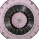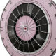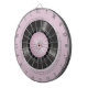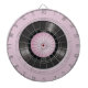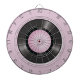 Ein kreisförmiges Dartboard, das an eine Schallplatte erinnert und ein schwarzes Zentrum mit einem rosa Spiralmuster aufweist, das nach außen abstrahlt.