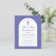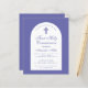Eine moderne erste Einladung zur Kommunion. Auf violettem (lila) Hintergrund ist ein weißer Bogen mit violettem Text innen. Der Anlass und der Name sind in einem eleganten kalligrafischen Skript geschrieben; die erste Zeile ist ein gewölbter Text.
