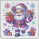 Ein fröhlicher Santa-Charakter in einem lebendigen violetten Outfit trägt fröhlich farbenfrohe Geschenke umgeben von festlichen Dekorationen. Schneeflocken und Schmuckstücke schweben in der Luft und schaffen eine reizvolle Urlaubsatmosphäre, die perfekt für Weihnachtsfeiern geeignet ist.