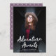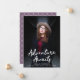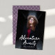 Trendy Graduierungsankündigungen mit dem senkrechten Foto des Absolventen mit "Adventure Awaits" in weißer, handgeschriebener Schrift. Personalisieren Sie die Front der Abenteuer Awartet Graduierungsankündigungen, indem Sie den Namen des Absolventen, den Namen der Schule und das Abschluss Jahr. Die Ankündigung kehrt zurück, um ein elegantes lila-weiße Trellis-Muster zu zeigen.