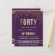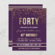 Violett | Budget Gold Confetti 40. Geburtstag Party Einladungen. Diese formelle, elegante, trendige, moderne 40. Geburtstagsfeier eignet sich für Damen und Herren. Es besteht aus goldfarbenen, klaren Linien, stilvollem, gothischem Großbuchstaben und raffiniertem Imitat Goldfolientext auf einem königlich lila Hintergrund mit Duschen von glitzernden, glänzenden Goldkonfetti und Party-Bänder.
