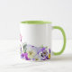 Ein eleganter Rahmen mit violett-lavenfarbenen, lila und weißen Stiefmütterchen in Weiß. Vorlagen für einen Monogramm-Buchstaben und einen Namen, rosa und lila Buchstaben.