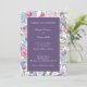 Diese Einladungskarte ist in verschiedenen Größen, Formen und Papieren erhältlich. Es ist mit Intro, Namen und/oder Monogrammen, Anlass, Datum, Adresse und anderen Hintergründen anpassbar. Es zeigt eine harmonische Mischung aus blumenfarbenen Wildblumen und Grün. Das minimale violette, lila Overlay dient zur Anpassung. Genießen Sie die herrliche Aussicht auf eine Violett-inspirierte Wildblume. Reiche lila Akzente inmitten üppiger Vegetation Set die Bühne für ein großes Fest, das Opulenz und Eleganz ausstrahlt. Hobinishop
