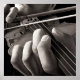 Dieses hyperrealistische Ölgemälde von Jeff Bartels zeigt einen Geigen spielenden Mann. Das eng zugeschnittene Schwarz-Weiß-Bild schaut den Geigenhals hinunter mit der Hand des Geigen im Vordergrund. Starkes Licht und Schatten zusammen mit der extremen Perspektive verleihen diesem Gemälde ein beeindruckendes und dramatisches Gefühl.