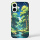 Wallpaper in Viral Anime, im Stil einer von Hayao Miyazaki inspirierten digitalen Illustration, mit einem ruhigen Wald mit mächtigen alten Bäumen, gedämpftem Sonnenlicht, das durch die Blätter gefiltert wird, einem sanften Bach, der durch die Szene fließt, und mystischen Kreaturen, die hinter dem Blattwerk hergucken; lebhafte und warme Farbtemperatur, kosmos beleuchten mit Sternen im Himmel, Menschen, die Atmosphäre ist ruhig und bezaubernd —v 5 —stylize 1000