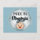 Diese lustige Postkarte zeigt ein niedliches, weißes Babygesicht, das auf blauem Hintergrund "Made in Virginia" steht. Ideal für neue Babyankündigungen oder einfach nur zum Spaß.