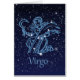 Karte mit dem Zodiaksymbol für Virgo in weichem silberblauem Blau, überlagert mit den Sternen der Sterne, vor einem Sternenhimmel-Hintergrund, der von tiefer Mitternacht blau bis schwarz gestuft wird.