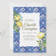 Besteht aus kursiver Schrift und Serif-Typografie auf grünen Blattpflanzenblättern; Alle vor einem Hintergrund von weißen, gelben und blauen mediterranen Fliesen mit Aquarellgelb Zitronen. Dies ist eine Vintage Feier des Lebens, der Beerdigung oder der Gedenkveranstaltung.