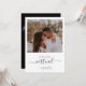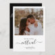 Rustikales minimalistisches Design mit modernem Drehbuch , botanischem Blumenblatt mit Foto und schwarzem Kartenhintergrund. Personalisieren Sie einfach Ihre gewünschten Informationen. Ideal einfache Hochzeitseinladung für eine virtuelle Online Hochzeit.