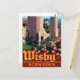 restauriertes und digital erweitertes Reiseplakat, in dem Menschen durch ein Portal in der Steinringwand in Visby eintreten und aus Visby austreten; ein Strauß mit Rose schmückt den Rand. Unvollkommenheiten beseitigt. Farben korrigiert. Bild mit freundlicher Genehmigung der Kongressbibliothek.