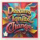 Ein lebendiges Design mit dem Text "Dreams Ignite Change" in einer farbenprächtigen Farbpalette, begleitet von goldenen Touchs, die wie Sterne schimmern. Die mutige Typografie ist von abstrakten Formen und wirbelnden Mustern umgeben, die die Energie und das Potenzial der Kreativität symbolisieren. Dieses Stück inspiriere den Zuschauern, ihre Wünsche zu erfüllen und sie in die Realität umzusetzen."Das Original Bild wurde von Meta AI erzeugt. AI generierte Kunstwerke. Lizenziert unter CC BY-SA 4.0.