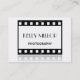 Visitenkarte mit Filmstreifen-Design - ideal für Ihr Fotounternehmen. Diese Karte ist bereit für die Anpassung an Ihre Geschäftsinformationen. Alle Texte können geändert werden: Sie können Stil, Farben, Größen ändern, Textfelder hinzufügen oder entfernen, um Ihren Anzügen zu entsprechen. Wenn Sie Hilfe benötigen, schicken Sie bitte eine E-Mail an Kirsty auf kirsty_pargeter@yahoo.co.uk