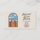 Visitenkarten mit handgezeichnet Illustration eines Buntglasfensters mit blauem Himmel, weißen Wolken und rot-gelben Gebäude: perfekt für Glasmaler, aber auch Innenarchitektur, Florist, Künstler, Hochzeitsplaner, etc.