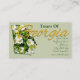 Obwohl man manchmal den "Empire State of the South" nennt, ist Georgiens offizieller Spitzname "Der Peach-Staat". Kein Wunder. Georgien ist der größte Produzent von Erdnüssen, Pekanen und Pfirsichen. Die Rose Cherokee, hübsch und duftend, hat eine traurige Geschichte mit ihr verbunden. Ein tragisches Ereignis im Jahr 1838, bei dem Tausende von Tscherokee aus Georgien und anderen Ländern östlich des Mississippi-Flusses vertrieben wurden. Der von den Indianern eingeschlagene Weg wurde als "Weg der Tränen" bezeichnet, weil die Cherokee-Frauen auf der Reise Tränen vergossen haben und die Anzahl der Indianer, die auf diesem Weg gestorben sind. Die Häuptlinge, so sagen sie, beteten um ein Zeichen, um ihren Frauen Hoffnung zu geben. Man sagt, wo immer eine Träne fiel, blühte eine Cherokee-Rose. Die Blume blühen heute weiter auf dem Weg. Georgien wurde 1788 zum 4. Staat. Als einer unserer "älteren" Staaten ist es überraschend, dass der Staat "Georgia On My Mind" 1979 adoptiert wurde und die offizielle Staatsflagge erst 2003 stammt. Trotz seiner reichen Geschichte, gut und schlecht, ist Georgien eine der modernsten Städte des Landes: Atlanta. Es ist eine Zuhause. Atlanta ist auch der Geburtsort von Coca-Cola. Dieses reizvolle Design würdigt diesen schönen Staat. Die Kontur des Staat ist voll von den hübschen weißen Blüten der Rose Cherokee. Dies ist mit dem gelben Gold "Georgia" überlagert. Diese hübschen, vollständig anpassbaren Visitenkarten sind eine ausgezeichnete Wahl für Georgia Tour Guides, Georgia Travel Agencies oder alle Geschäfte, die mit Georgien Tourismus verbunden sind.