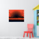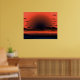 Diese moderne Deko-Darstellung zeigt einen blutroten Sonnenbrand über dem Strand, an dem Vögel vorbeifliegen. Dunkle Wolken fegen sanft den Himmel. Eine unheilvolle Szene am Strand.