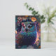 Eine Postkarte mit einer wunderschön lebhaften Eule in Regenbogenfarben, umgeben von Blume.
