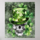 A vivid, green St. Patrick’s Day illustration featuring a skull wearing a shamrock-adorned hat with a 4 leaf clover in the mouth.