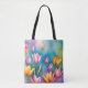 Erfrischende Regentage mit den fröhlichen Tulpenfarben auf dieser vielseitigen Tasche. Kühne Farben und zarte Blütenblätter vereinen sich in einer Tasche, die Köpfe überall hin dreht. Aquarellkunst trifft auf funktionales Design - weiche, aber robuste Tasche mit blühenden Tulpen, die Sie lieben. Ideal für Pflanze-Liebhaber, Künstler und alle, die die Schönheit von unterwegs schätzen.