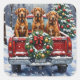 Bring warmth to the holiday season with this beautiful Vizsla Christmas design! This vibrant scene features three loyal, russet-colored Vizslas sitting attentively in the back of a classic red pickup truck, parked in a serene snowy winter forest. The vintage truck is charmingly decorated with a festive Christmas wreath, adorned with sparkling red and gold ornaments and warm, glowing lights. Soft snowflakes drift down, enhancing the winter wonderland effect. A decorated Christmas tree in the background completes this heartwarming picture, making it an ideal Christmas gift for any Vizsla owner, dog lover, or enthusiast of festive and elegant dog breeds. This artwork perfectly captures the joyful spirit of the holidays.