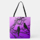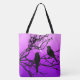 Tote Tasche mit zwei kleinen Vögeln, auf einem Zweig, als schwarze Silhouette gegen einen zwielichtigen Himmelsverlauf von tief lila zu weich violett, mit dem schlanken Halbmond eines neuen Mondes