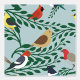 Viele Vogelarten auf Zweigen; Robinen, Kardinäle, Spechte, Goldflossen, Spatz und Maden auf einem aquamarinen Hintergrund.