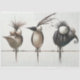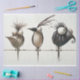 Das Stark Perch Trio, eine Gruppe von drei stilisierten Vögeln, die auf einem Seil stehen, jedes mit seinen eigenen einzigartigen und übertriebenen Merkmalen: Spiky Feather Bird: Der verlassen Vogel hat lange, spitze Federn, die aus seinem Kopf und Schwanz hervorragen, und ähnelt einer Explosion von Linien, die ihm ein dramatisches und edles Aussehen verleiht. Striped Surprise Bird: Der mittlere Vogel ist schlank mit senkrechten Streifen und Federn, die an der Spitze des Kopfes hängen, sodass er einen überraschenden und sonderbaren Look erhält. Plump Comical Bird: Der Vogel auf der rechten Seite ist plump mit großen, runden Augen und einem kleinen Schnabel, was ihm einen etwas komischen und liebenswerten Ausdruck verleiht. Set vor einem einfachen Hintergrund, die krassen und übertriebenen Merkmale dieser Vögel schaffen eine visuell beeindruckende und skurrile Szene.
