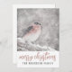 Eine ruhige und hübsche Vogel in der Winterschneezeit Weihnachtskarte in einem sanften, ruhigen Naturthema. Fügen Sie Ihren Familiennamen hinzu.
