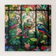 Dieses atemberaubende Buntglasdesign besticht durch farbenfrohe Vögel inmitten blühender Pflanze.