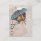 Zwei orange Vögel mit rotem Backenschutz unter einem blauen Regenschirm während eines Schneesturmes in einer viktorianischen Geschäftskarte vom 19. Jahrhundert.