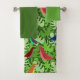 Dieses Handtuchhandtuch ist mit einem grünen Waschlappen, einem dunkleren, grünen Handtuch und einem Badetuch ausgestattet, das in Blätter von Vögeln in naturgetreuer Manier gestaltet wurde.