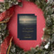 Einladung zum Gedenkgottesdienst in Holzkohle und eine Touch warmer, blassorangefarbener Orangen mit einem Foto von zwei Vögeln, die bei Sonnenaufgang auf dem Ozean landen, und der Begräbniseinladung in Goldfolie.