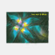 Ein buntes Fraktal, das einem Dschungelvogel ähnelt. Die Primärfarbe ist grün; Blau und Gelb sind ebenfalls hervorgehoben. Passen Sie Ihren eigenen Text an.