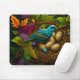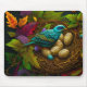 Dieses Mousepad hat ein künstlerisches Vogelbild darauf.