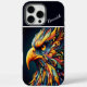 Ein naher Blick auf den Vogelkopf, mit einem lebendigen, abstrakten Muster, das seine Federn bedeckt. Das Auge ist mit einer gelben Iris hervorgehoben.