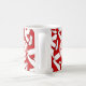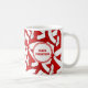 Diese Tasse mit roten und weißen Volleyballfarben kann auf einer Seite der Tasse mit dem Namen des Trainers auf einer einfachen weißen Volleyballgrafik und auf der anderen Seite mit dem Namen der Mannschaft, dem Namen der Schule und der Sportsaison/des Jahres auf einer zweiten weißen Volleyballgrafik auf der anderen Seite abgestimmt werden - Hintergrund ist eine Gruppe von roten und weißen Volleybällen, die in einem übergroßen Spiegelmuster angeordnet sind - von katz_d_d_katz ynes