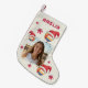 Celebrate the holiday season with a personalized touch using this festive Santa Hat Volleyball Photo Christmas Stocking. Perfect for volleyball players, coaches, or fans, this unique stocking allows you to add a photo and a custom name. Featuring playful volleyballs adorned with Santa hats and delicate red snowflakes on a cream background, it's an ideal way to showcase your passion for the sport while decorating for Christmas. A wonderful gift for an athlete or a memorable addition to your holiday decor, creating lasting memories.