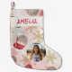 Celebrate the holidays with a sporty flair using this unique personalized Christmas stocking. Featuring a charming watercolor design with festive pink and red hues, sparkling golden snowflakes, and stylish volleyballs with Santa hats. Personalize with name and photo, making it an ideal gift for volleyball players, coaches, or fans. Hang it by the fireplace with care, ready for Santa to fill with treats, and add a special touch of their favorite sport to your holiday decor.
