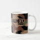 Weiße Tasse mit "lud völlig" Slogan Armeeim militärart-Schriftart gegen Tarnungshintergrund (bräunt sich, Grüntöne, Braun und Schwarzes)