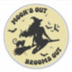 Ein witziges Halloween-Design mit einem leuchtend gelben Vollmond mit der Silhouette einer geschmeidigen Hexe, die auf einem Besenstiel mit ihren treuen, bekannten schwarzen Katzen reitet, und Sternen umkreisen und groovy gekrümmten Text hat den lustigen Satz: Moon's Out Brooms Out. Der perfekte Halloween-Aufkleber für Laptops, Umschläge, iPads, Notebooks für eine gute Zeit.