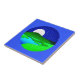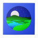 Keramik-Kachel in kreisförmiger Abbildung eines Vollmonds, der durch grüne Hügel an einem Seeufer aufsteigt, mit einem sternenblauen Himmel mitten in der Nacht