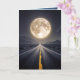 Eine lange, gerade Straße erstreckt sich zu einem massiven, glühenden Vollmond am Horizont, umgeben von weit entfernten Bergen unter einem sternförmigen Nachthimmel. Inside text kann geändert werden.