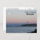 Travel Postcard mit dem landschaftlichen Foto eines Vollmonds, der den Berg Rainier und die Cascade Mountains bei Sonnenuntergang von Tacoma aus, Washington, beleuchtet.