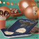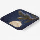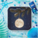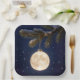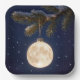 Ein strahlender Vollmond-Weihnachtsschmuck wird anmutig von einem schneebedeckten Kiefernzweig abgehängt, umgeben von einem bunten, sternförmigen Band am Nachthimmel